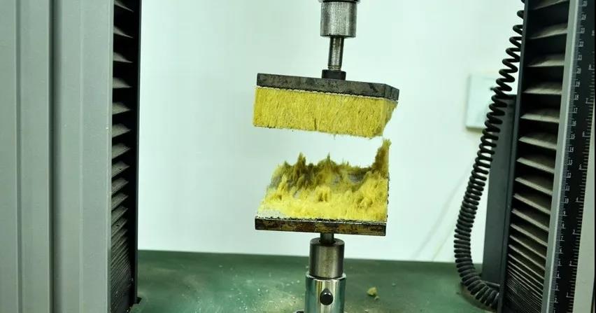 巖棉復合板以豎絲巖棉條為保溫芯材,改變了傳統巖棉板的纖維分布方向和運動方向,使傳統巖棉板/條垂直于板面方向的抗拉強度由≥10kPa/80kPa提高至≥100kPa,整體產品穩定性較高,不易開裂。