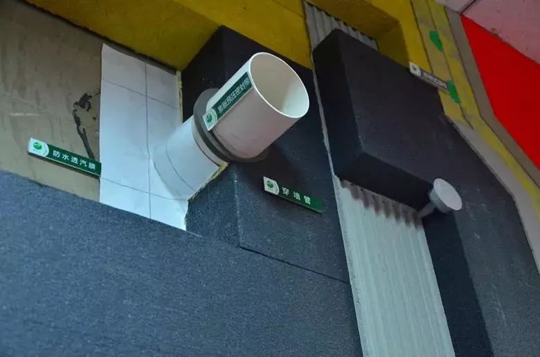 氣密性處理:門窗洞口、穿墻管道內側應粘貼防水隔汽膜,外側應粘貼防水透汽膜。保證室內水汽不能進入保溫系統的同時,還能使得保溫系統內一旦聚積水汽可以及時排出。