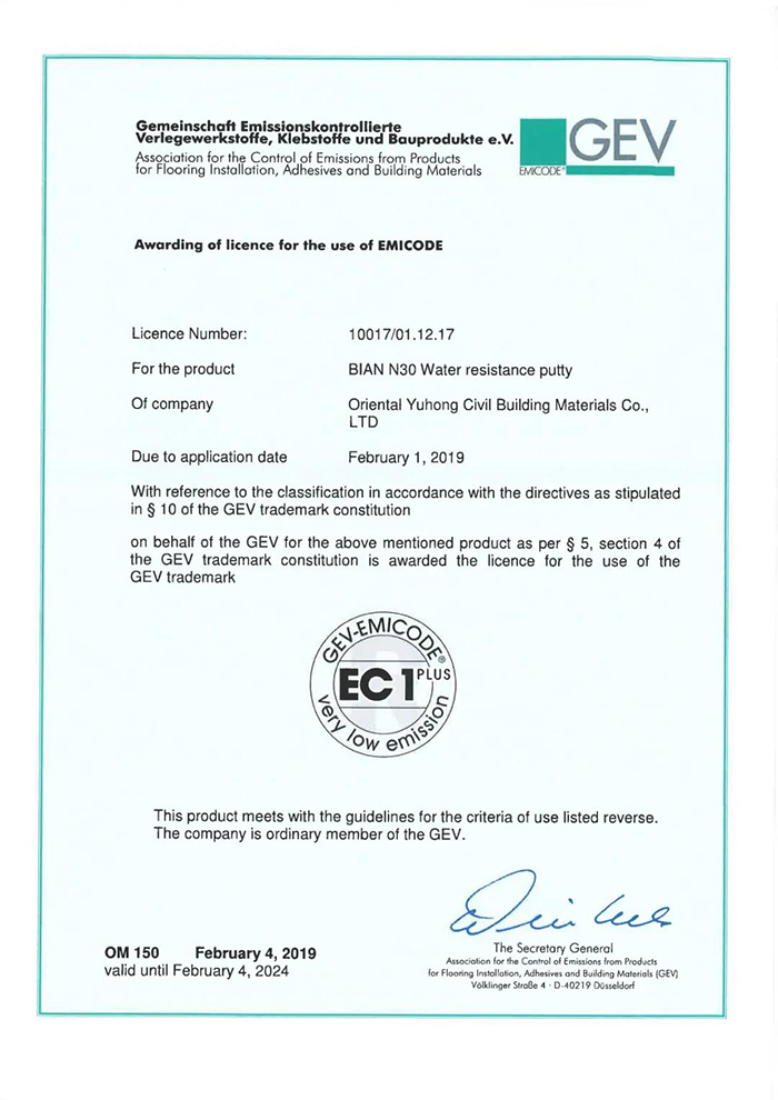 壁安抗堿防霉型N30耐水膩子通過歐洲建材環(huán)保性能權(quán)威認(rèn)證機構(gòu)——德國GEV建立的EMICODE分級體系最高標(biāo)準(zhǔn),獲得EC1PLUS證書,該產(chǎn)品可最大限度保證居住環(huán)境的空氣質(zhì)量。